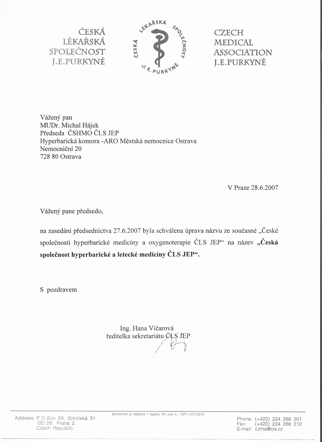 Na základě naší žádosti byla předsednictvem České lékařské společnosti schválena změna názvu na Česká společnost hyperbarické a letecké medicíny ČLS JEP. Změně předcházela bohatá diskuse uvnitř výboru a taktéž společné prohlášení nejvyšších představitelů oboru hyperbarická medicína a letecká medicína. Následovalo schválení výborem OS na schůzi v dubnu 2007.